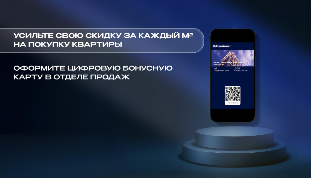 Группа компаний «ЮгСтройИнвест» запускает специальное предложение для покупателей: теперь вы можете получить дополнительную выгоду к уже действующей скидке за каждый квадратный метр при покупке квартиры. Все, что нужно сделать — оформить цифровую карту клиента прямо в офисе продаж.