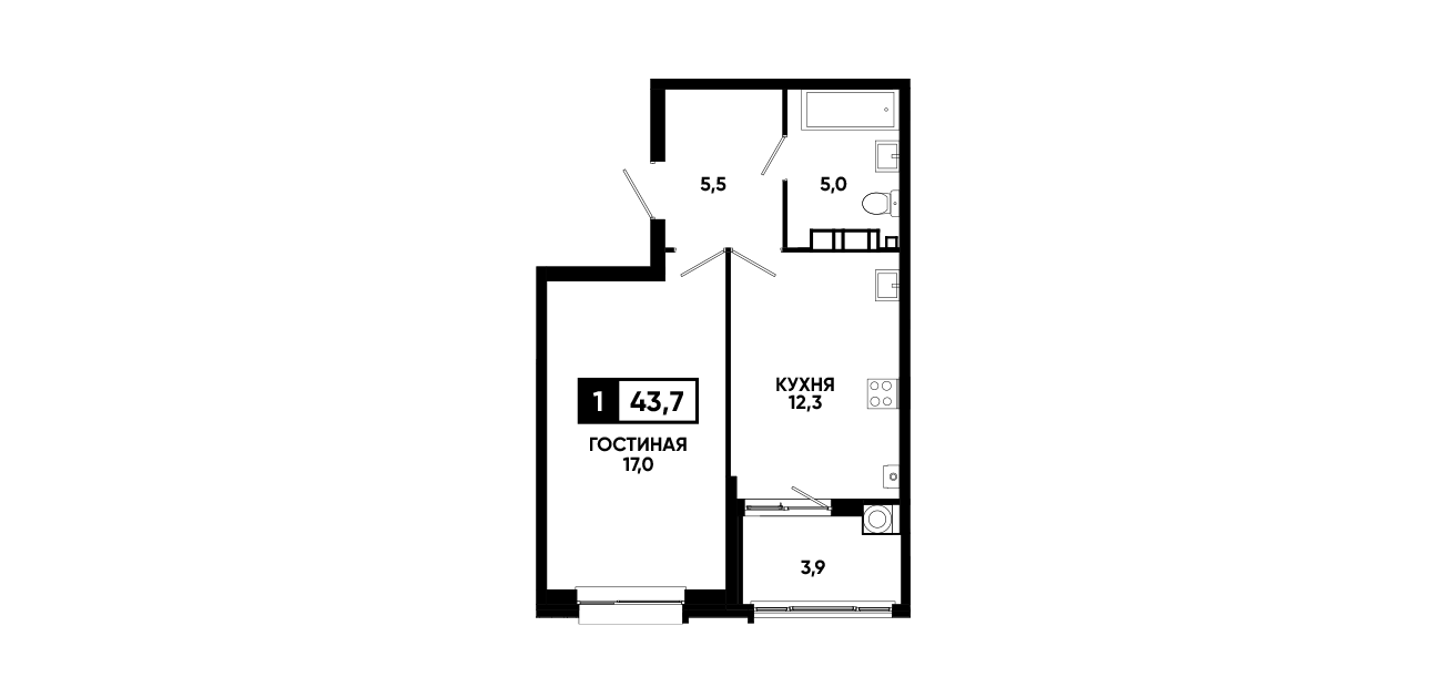1-комнатная квартира 43,70 м2