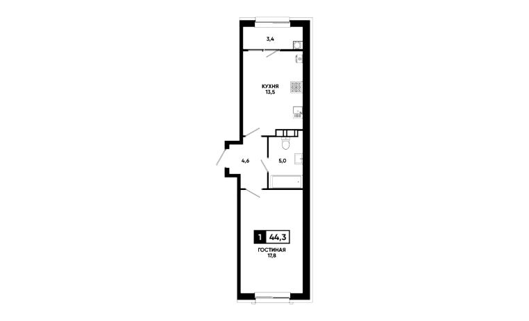 1-комнатная квартира 44,3 м2